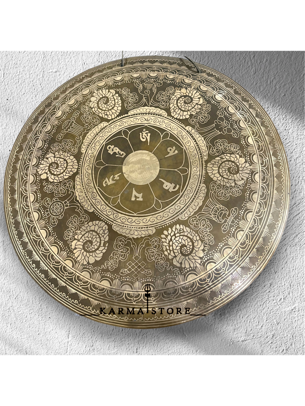 Sacred Mandala Gong – Hand-Etched Brass Gong with Om Mani Padme Hum Mantra